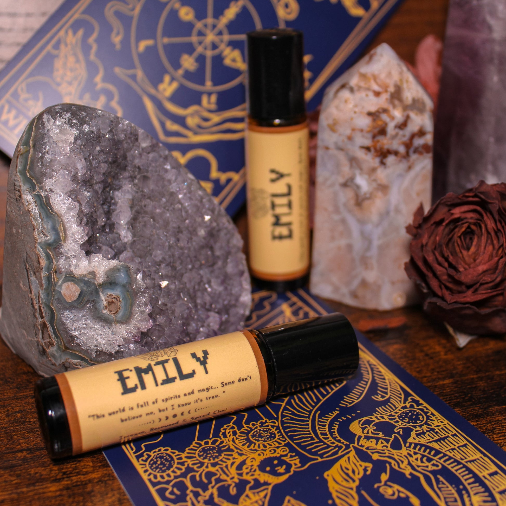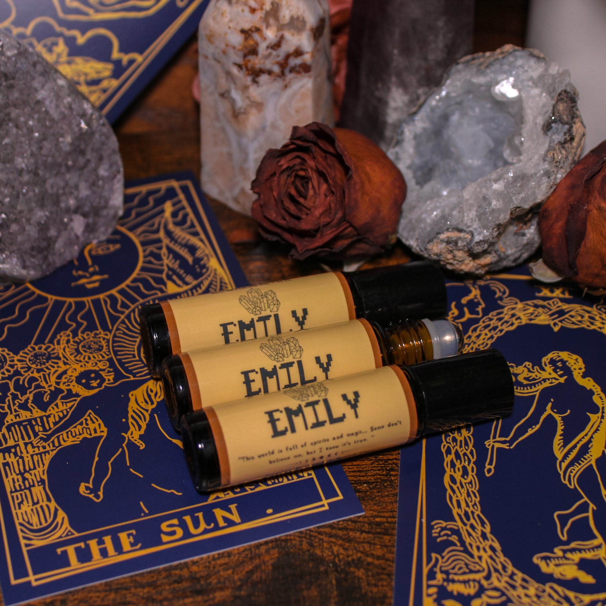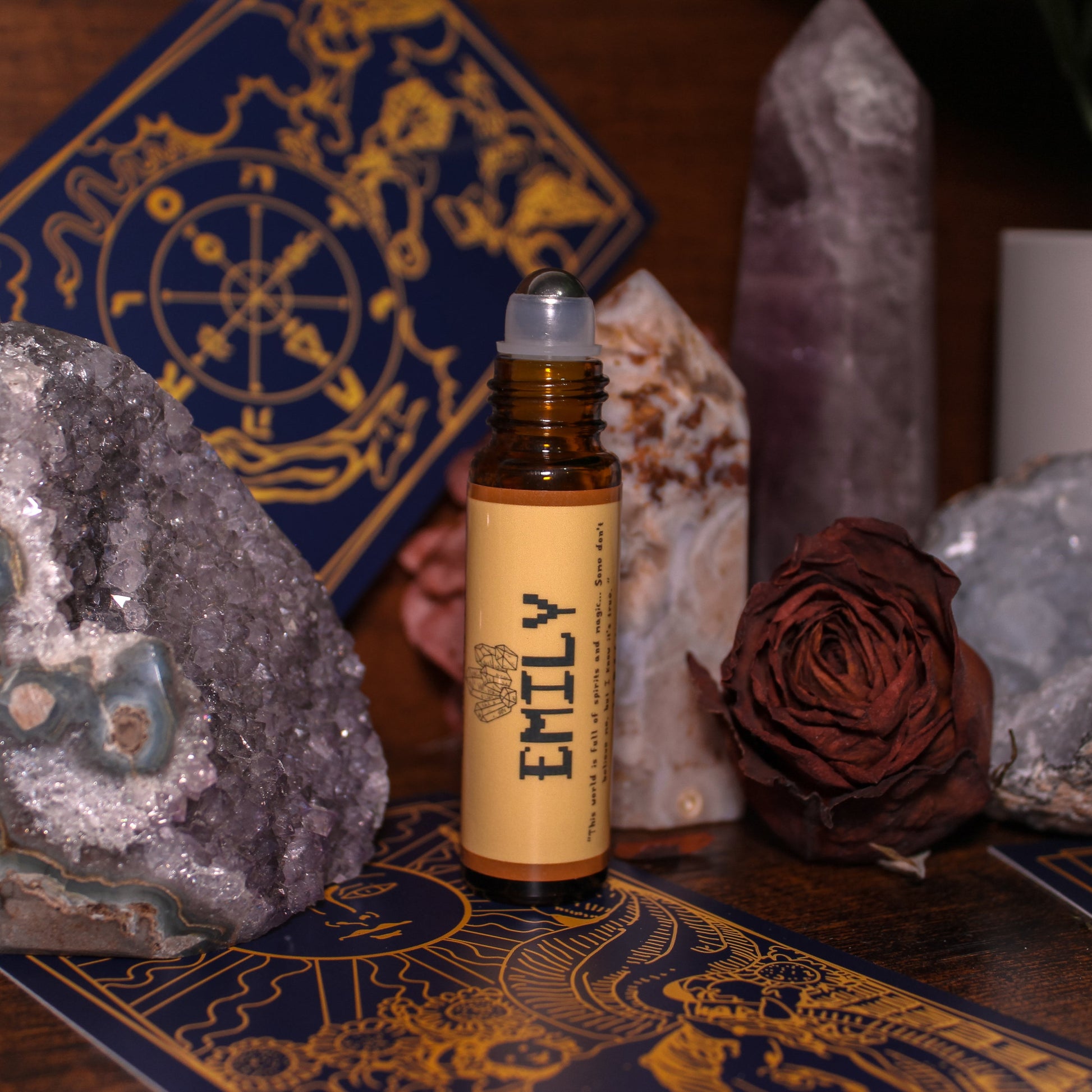 Taking inspiration from Emily's "crystal girl" aesthetic, this fragrance smells exactly like walking into a metaphysical shop. It is immediately very incense heavy, notes of laurel and frankincense blend with chai spice and tuberose. Rosewood and dragon's blood build out the base into something overall very resinous and spicy. Mystical and earthy, this fragrance represents Emily's love for all things different and kooky.