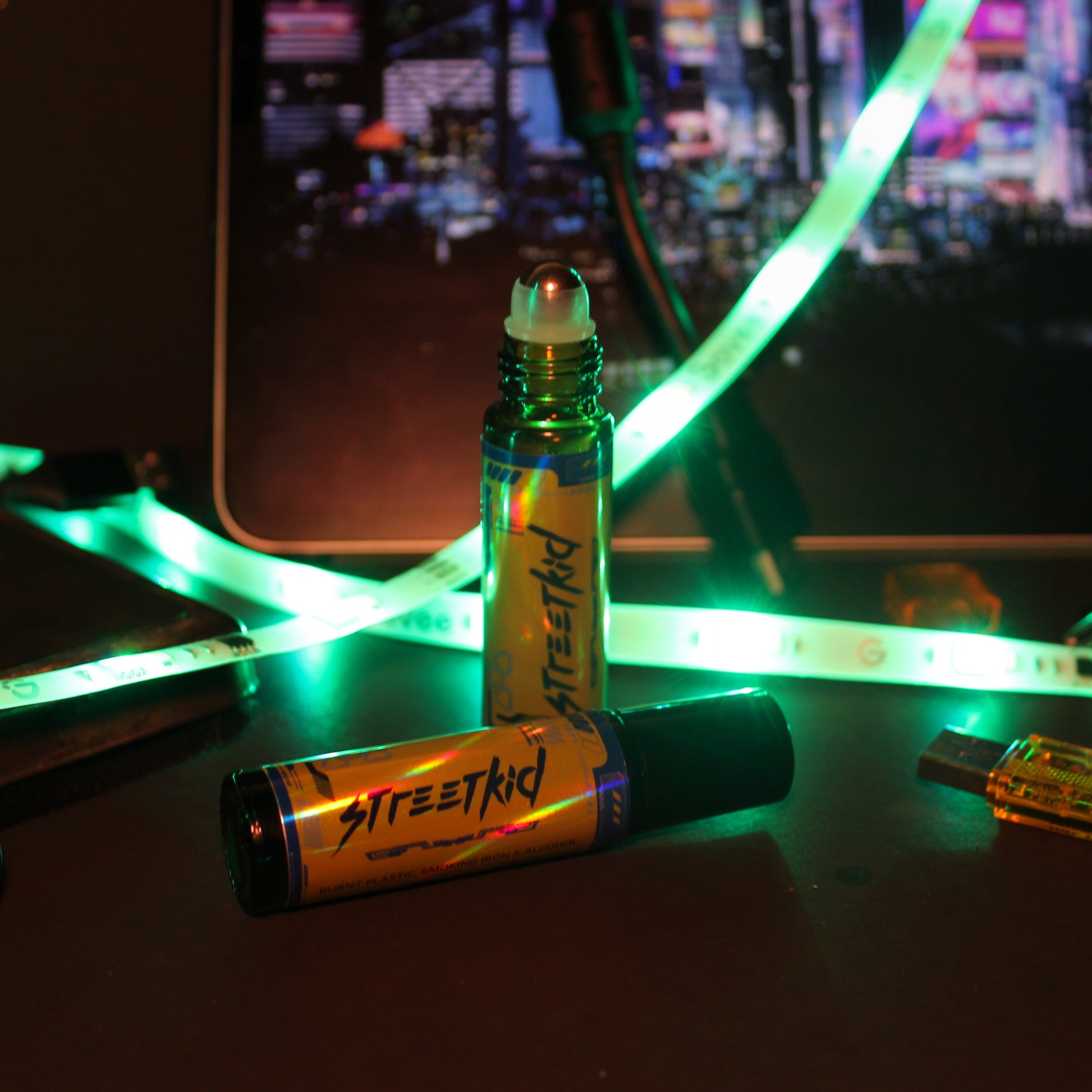 By far the most experimental fragrance we offer to date, Streetkid is for the dirty, the nasty, the grimey. Filled with synthetic and harsh notes, this blend starts with the acrid scent of burnt plastic and the twang of hot iron. Burning rubber joins the fray, combating with sharp and cool citrus notes. I cannot stress just how odd this one is. If you’re looking for your average fragrance, please be advised to try a different scent from the Cyberpunk collection.
